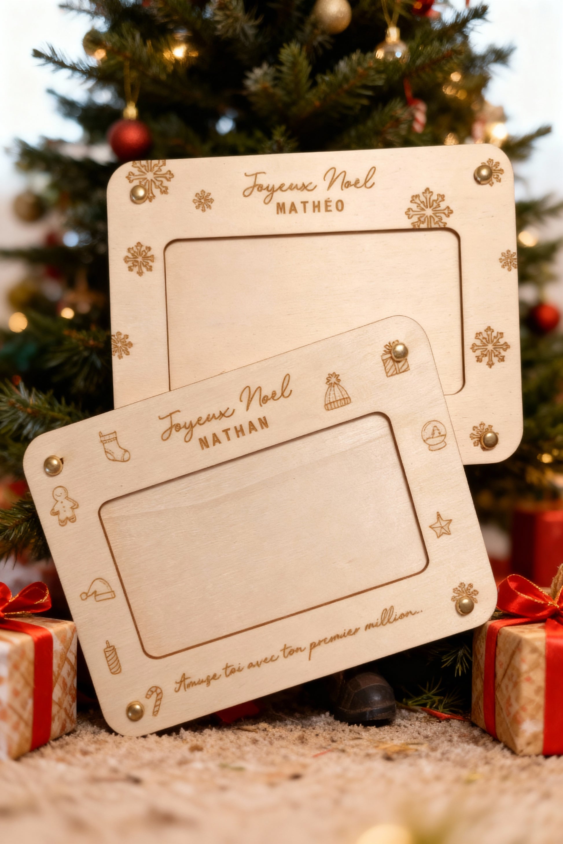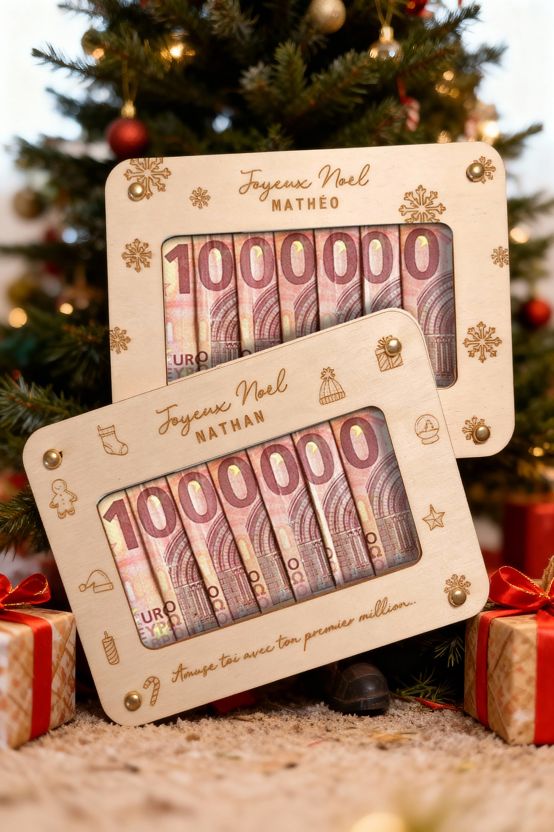 Carte en bois personnalisée avec le prénom de votre choix, parfaite pour célébrer avec humour les grands moments. Ce design original « Mon premier million » se décline en deux styles festifs : flocon de neige ou décoration de Noël. Son mécanisme d'ouverture intuitive en deux parties permet de glisser facilement vos billets à l'intérieur.