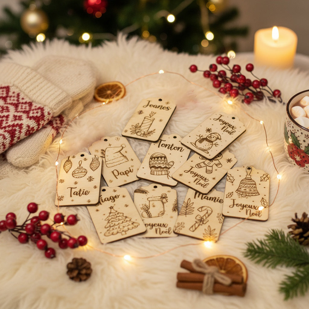 Apportez une touche unique à vos cadeaux de Noël avec ces élégantes étiquettes en bois. Personnalisable avec un prénom ou le texte de votre choix, elle ajoute un détail raffiné et chaleureux qui embellira votre emballage tout en rendant chaque présent vraiment personnel.