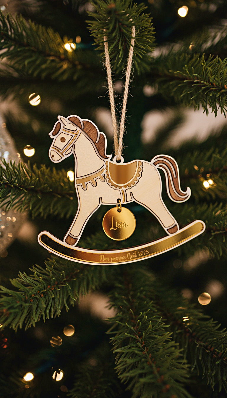 Suspension en forme de cheval à bascule, parfaite pour personnaliser votre sapin ou vos espaces festifs. Cette pièce de décoration allie charme rétro et élégance intemporelle, idéale pour créer une ambiance chaleureuse durant les fêtes.